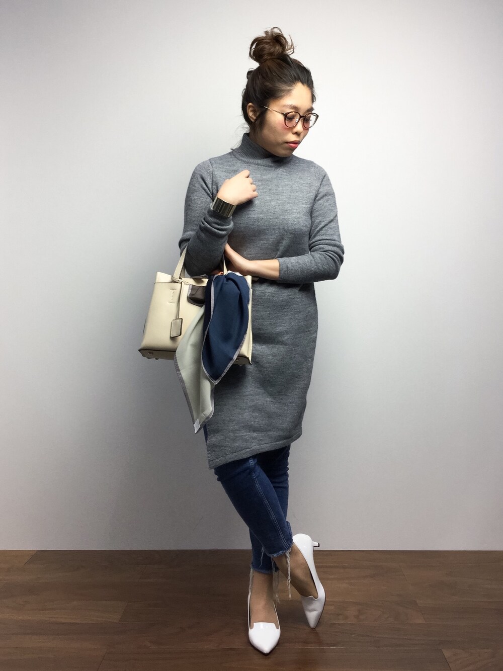 CLANEのニットワンピースに、ダメージデニム×ヒールを合わせた春のきれいめカジュアルスタイル。 シンプルなアイテムが多かったので、Ameriのスカーフをバッグにプラスしました。