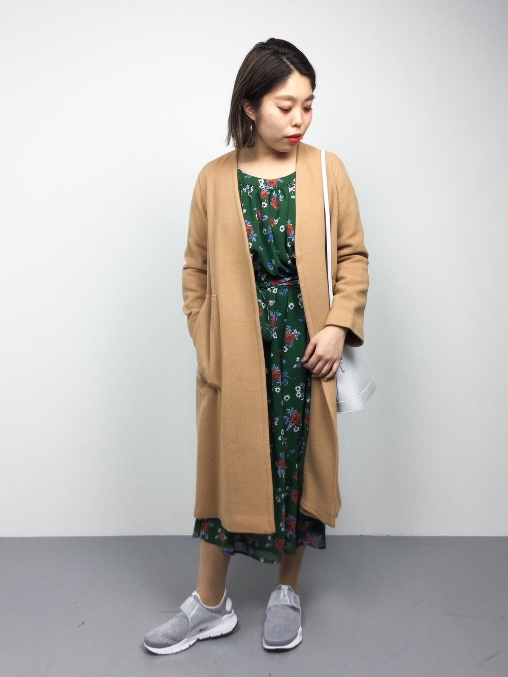 花柄ワンピースを使った、春のオトナカジュアルスタイル○ ワンピースの緑に合わせて、相性の良い色のコートを選んでみました。 さらにスニーカーでカジュアルダウンさせてます。 今回履いたスニーカーはNIKEのアイテムです。 とても軽く、さらに柔らかい素材で出来ているので、履いている感覚がほとんどありません、、! これからワンピースやスカートを履く機会が季節柄増えてくると思うので、 コーディネートのポイントになるような存在感のあるシューズはオススメですよ^^