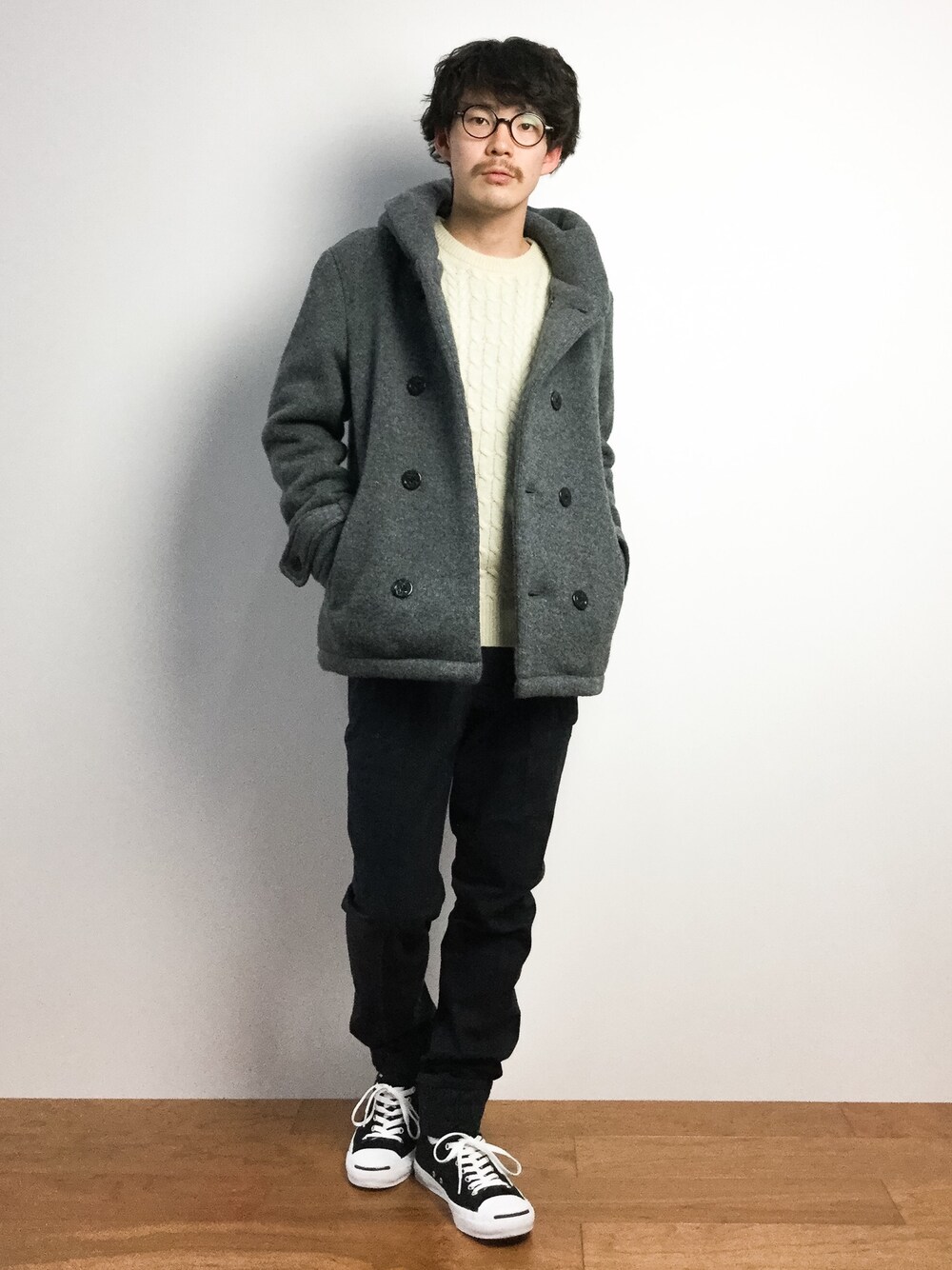 ナカニシアキラ(ZOZOTOWN)のピーコート「スライバーニットダブルフーディ」を使ったコーディネート