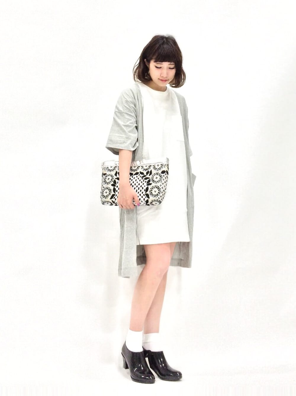 モノトーンコーデに、個性的な柄のクラッチでアクセントを。 靴はレインシューズなので、雨の日でもガシガシ履けます!
