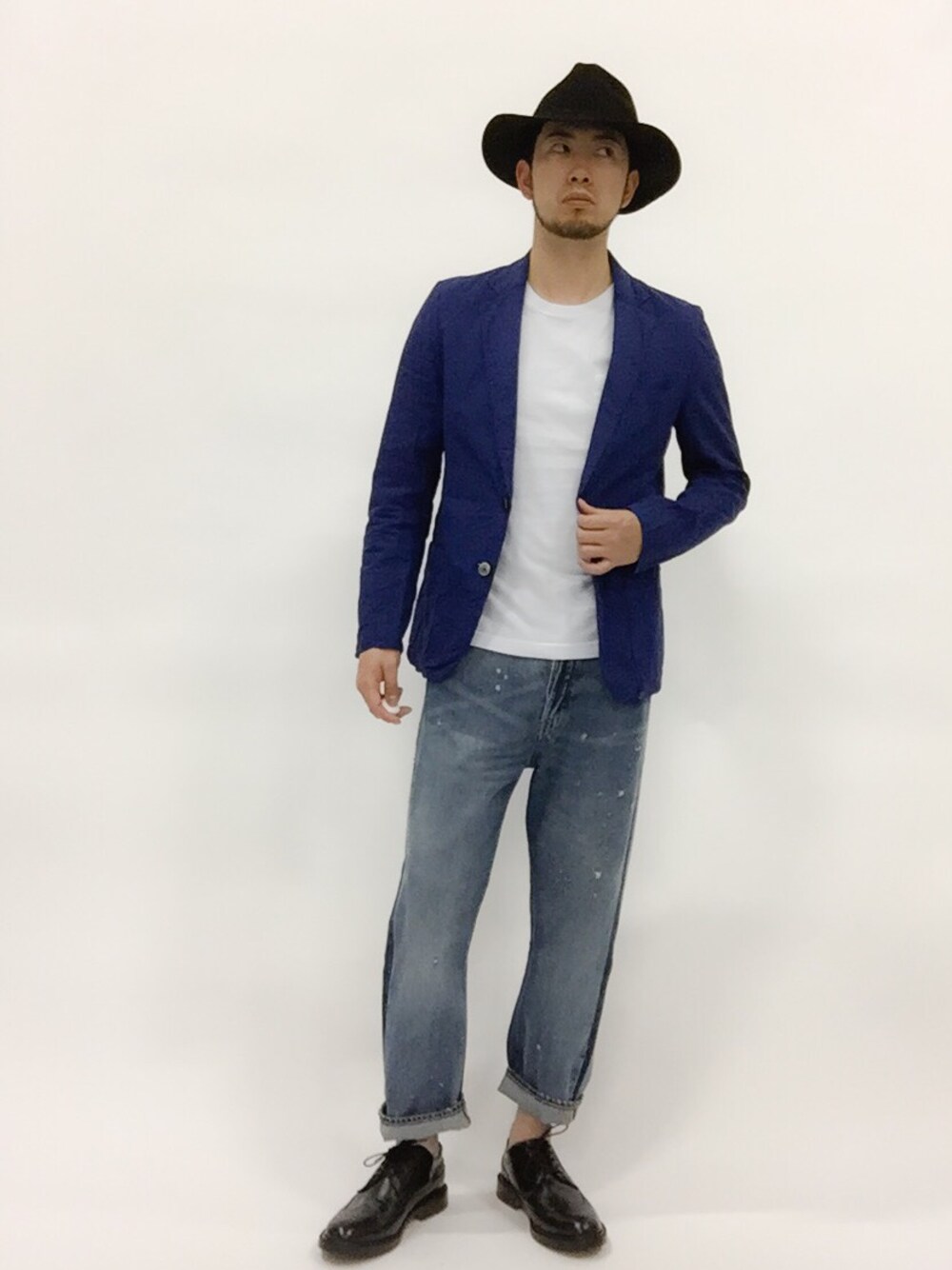 ブルーのジャケット×デニムでさわやかな色合いに♪ 足元には綺麗目の革靴を持ってきて大人感を出してみました!! Tシャツ 無地ポケットTは何枚持っててもいいですね。 ジャストサイズです。 ジャケット 麻×綿素材のジャケットは風通し&肌触りがいいです。 パンツ ウエストはジャストサイズ。 裾を細く見せたかったので一回ロールアップしてます。 シューズ ジャストサイズです!