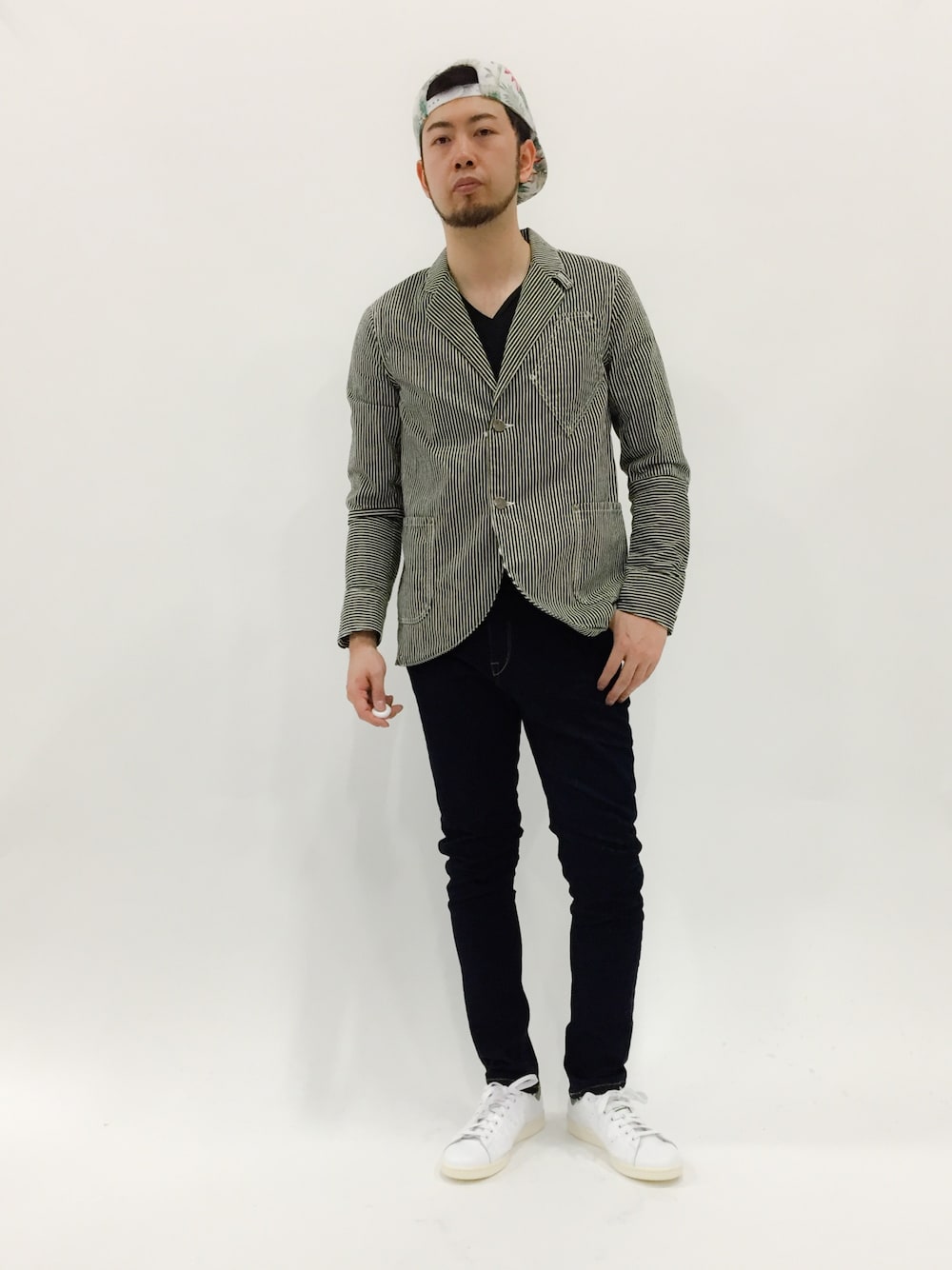 ヒッコリージャケットはおススメ! シンプルに細身のデニムとあわせました。 キャップを後ろ被りしてカジュアル感を。 【ジャケット】 ボタンを閉めて着用して、ちょうどいいサイズ感でした。 ボタンをあけず、閉めてジャストサイズで着るのがおススメ。 【パンツ】 ぴっちり、タイトな着用感です。 その分足もすっきり細く見えます。 【Tシャツ】 ちょうどよいサイズ感で、生地もやわらかく着心地よし。