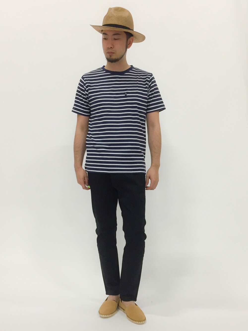 【ボーダーTEE】 シンプルなボーダーポケットTシャツは、一枚で着るもよし、インナーに着るもよしで使い回しがききます。 Lサイズでちょうどよいサイズ感です。 【パンツ】 シルエットがとても綺麗な細身のパンツです。 細身ですがストレッチがきいているので、フィット感、履き心地ともにとてもよいアイテムです。 Lサイズでジャストフィットです。 【シューズ】 とてもやわらかい生地で、履き心地がよいです。 42でジャストサイズでした。 【ハット】 通気性のよい素材感で、つば広なのでこれからの季節に活躍しますね。 頭周りはジャストフィットでした。