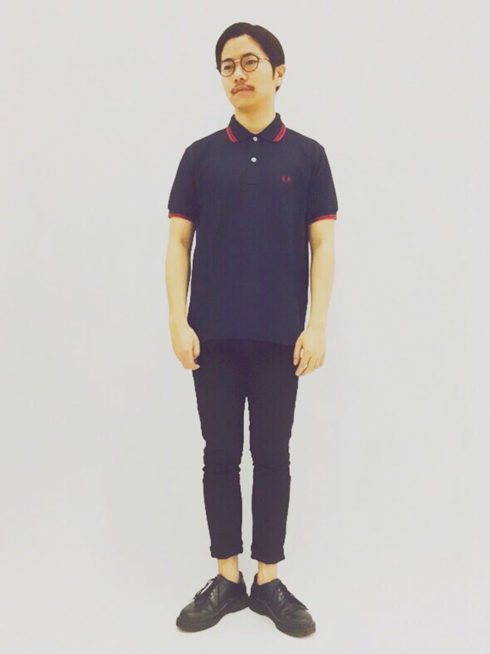 ポロシャツ×スキニーのコーデ。 超どシンプルですがこういう格好が1番好きだったりします。 ネイビーをベースとしたポロにレッドのティップラインが何ともかっこいいアイテムですね。 そして背中にはユニオンジャック!言うことなしですね! ちなみに「ティップライン」とは襟と袖の二本線のラインの事で、フレッドペリーが元祖となるデザインです。 サイズはMを着てますが、着用感的にはワンサイズ下でも全然入ります。