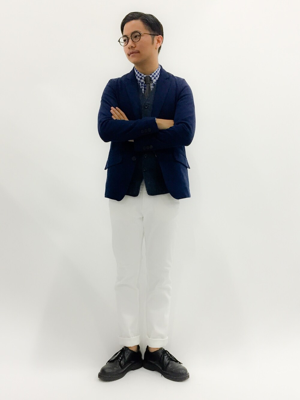 ネイビー×ホワイトの爽やかジャケットスタイリングです。