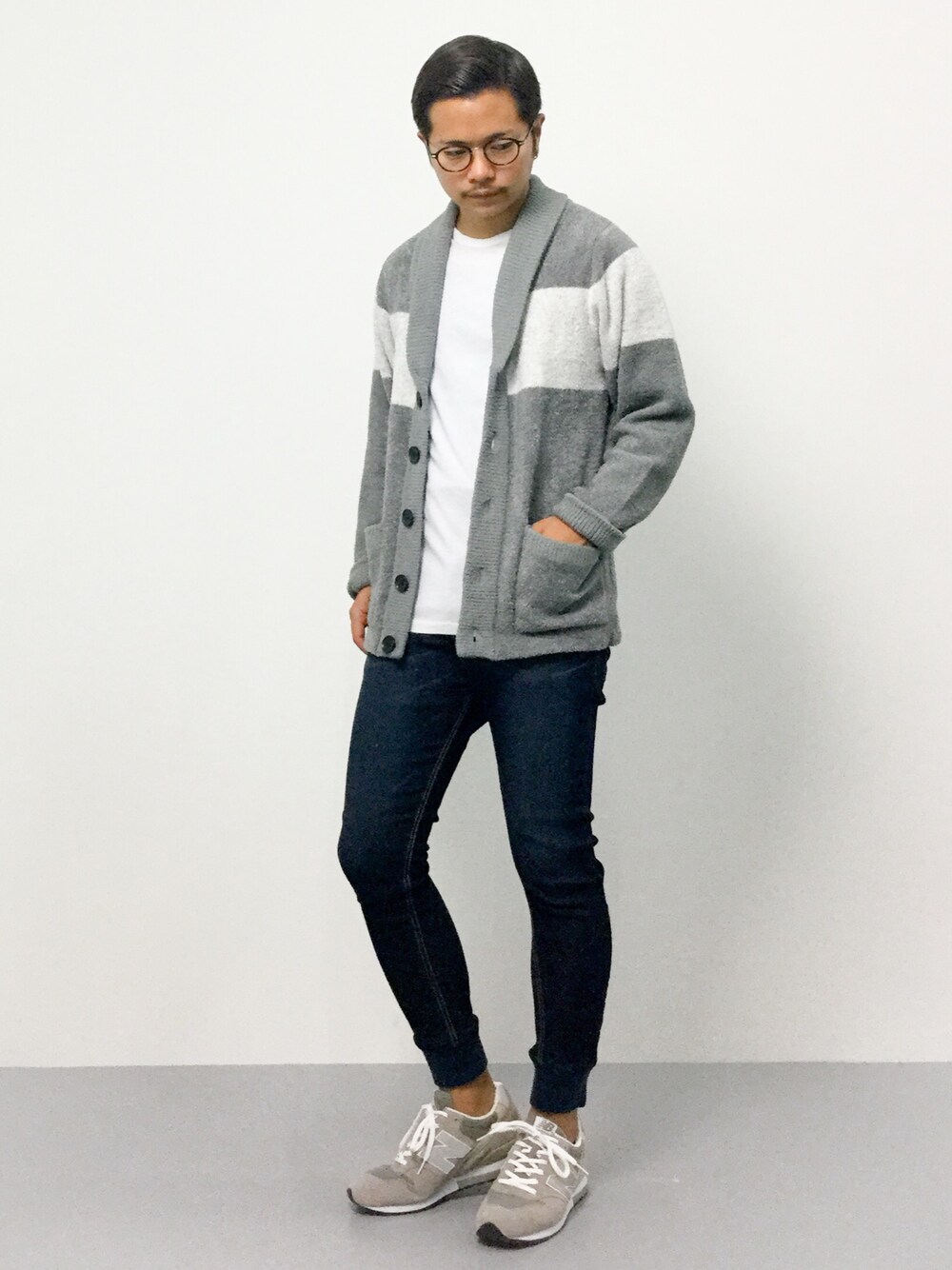 ショールカーデが主役のゆったりスタイルです。
