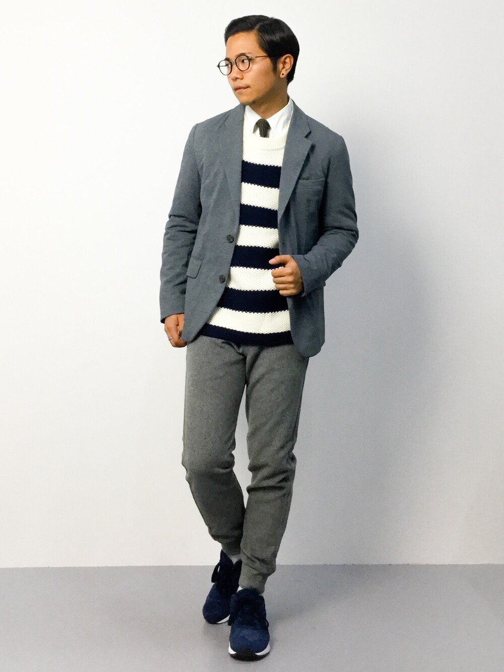 グレー×ネイビーのジャケットスタイル。