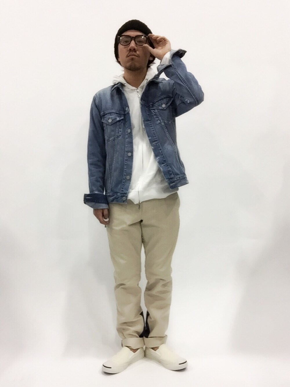 デニムジャケットとチノの王道コーディネート。 春らしく白いパーカーを中にきて、重くならないようにしてみました。 ジャケットはあえて大きめに着用して、ルーズ感を出しています。 ジャストで着用したい方は、サイズをさげて着ることをオススメいたします。