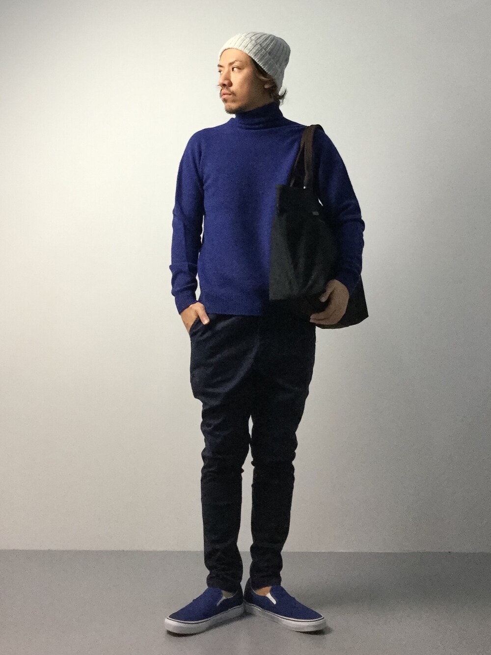 タートルネックニット×イージーパンツのラフスタイル。