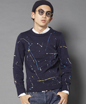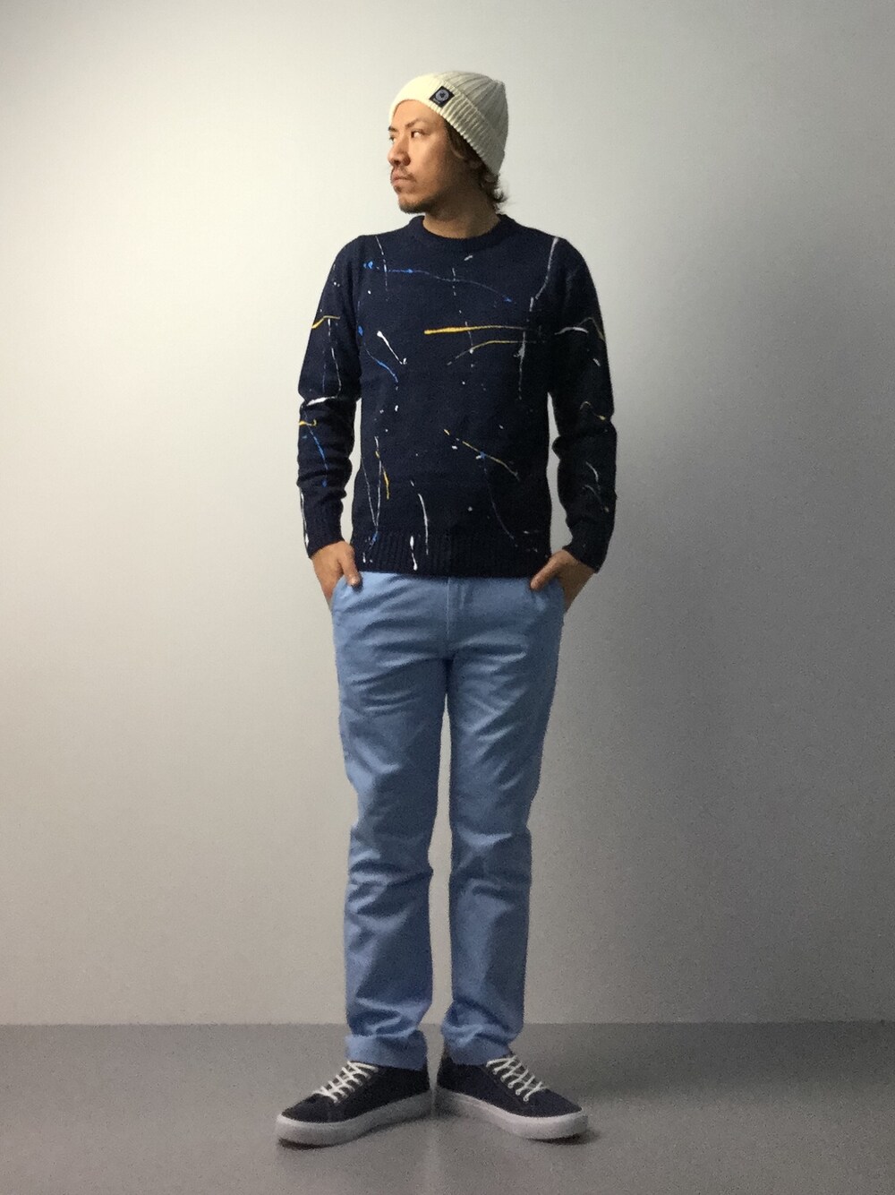 ブルーで合わせたニット×チノパンのカジュアルスタイル。