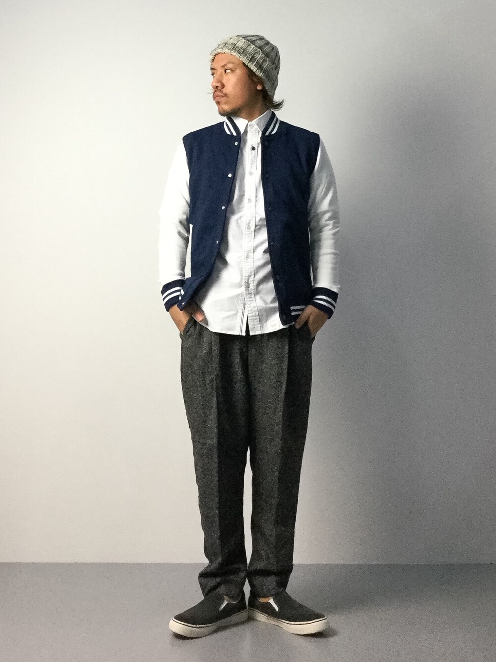 スタジャンと白シャツを合わせたカジュアルスタイル。