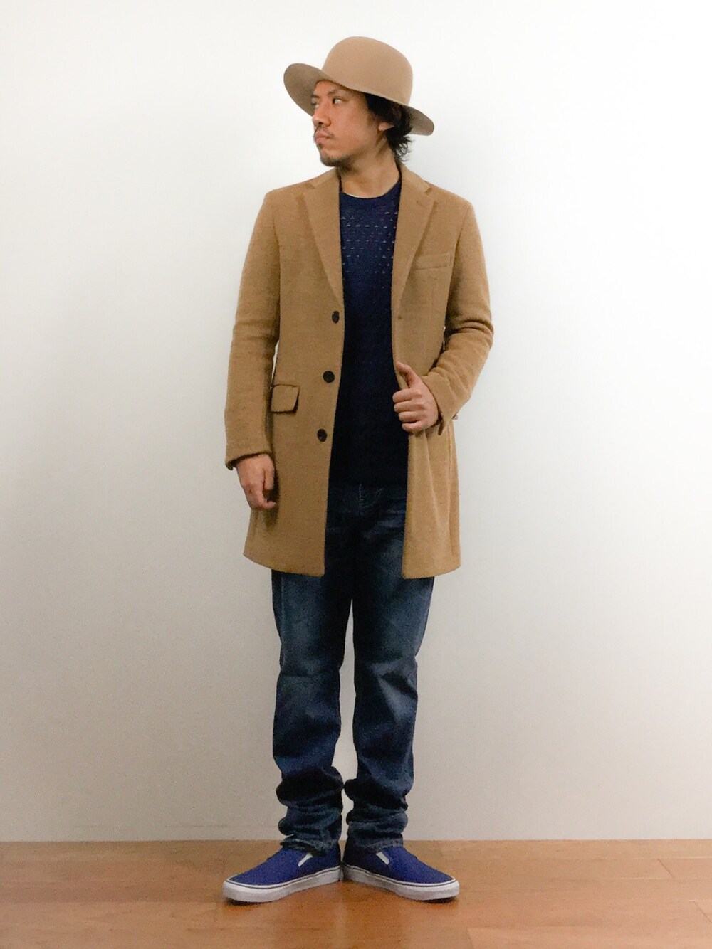 チェスターコート×デニムのカジュアルスタイル。