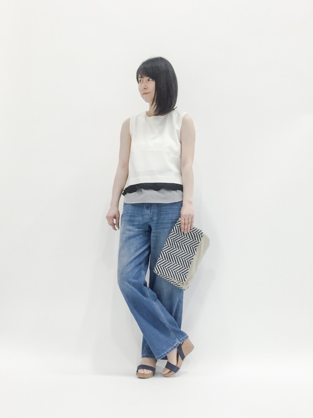 トップスは重ね着風になっていて、一枚着るだけで こなれた印象に♪ ペインターパンツは、生地がとても柔らかくて とても履き心地が良いです。 クラッチバッグとサンダルはネイビーで統一しました。