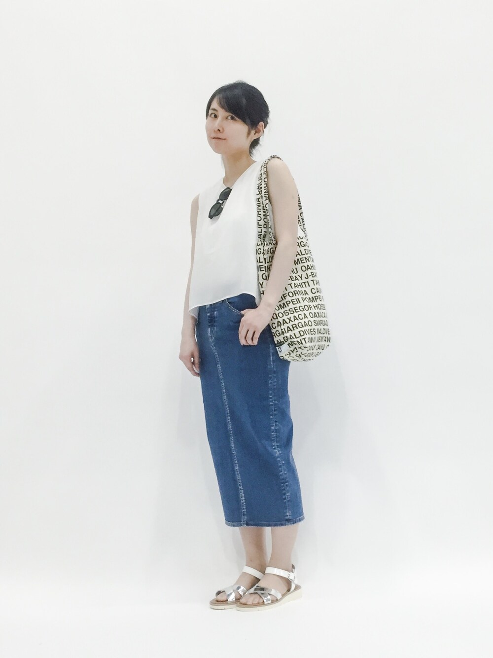 トップスは、異なる生地が二重になっていて、 様々な着こなしを楽しめます♪ 今回は、下の生地だけスカートにインして、 上の生地が揺れ動く感じにしました。 スカートは、絶妙な丈感でとてもきれいなシルエットです。 生地はストレッチがしっかり効いている上、 軽くて柔らかいので、履き心地がとっても楽ちんです♪ 後ろには、スリットがしっかり入っているので、 歩きやすさも◎です! トートバッグとサンダルで、 ラフなコーデにしてみました~