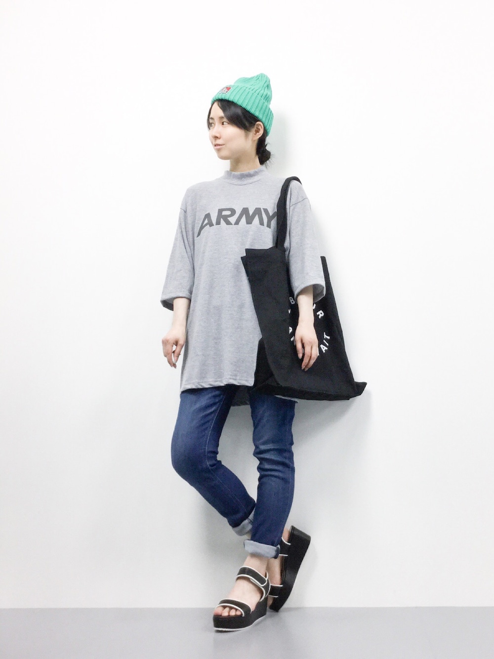 緑のキャップをアクセントに、カジュアルコーデにしました♪
