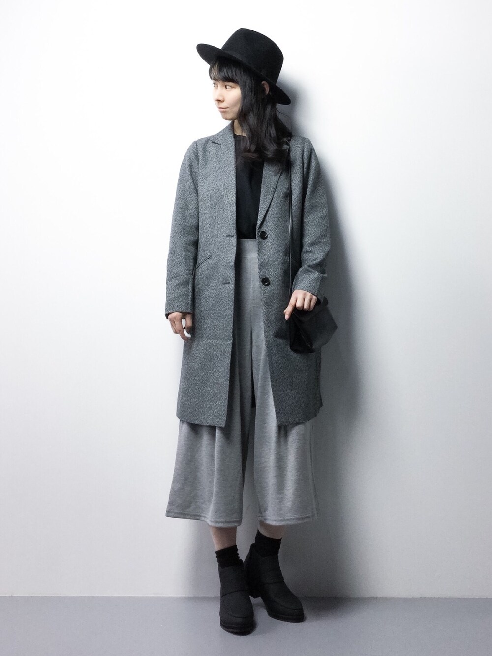 チェック柄のチェスターコートを羽織った、モノトーンコーデです*