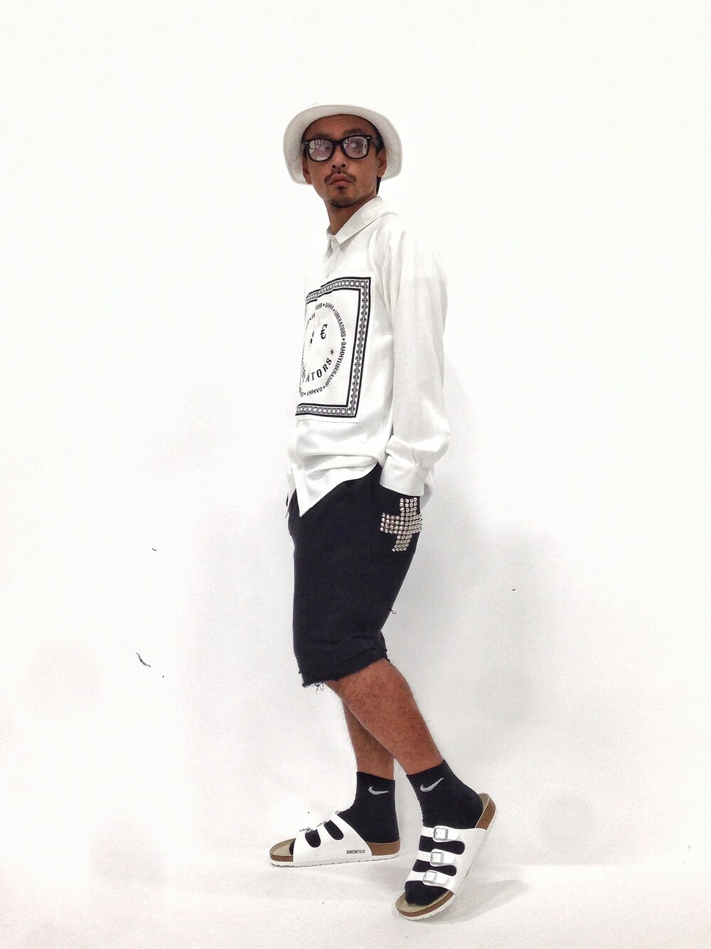 ハット しっかりとした生地感のコットン製。つばが広めのハットはどんなスタイルにも合わせやすいアイテムです。 シャツ/FREE DAMMYバンダナシャツ。ビックシルエットシャツですね。バンダナ柄のプリントも全体のバランスを考えたベストな大きさです。 ショーツ/M 裾部分には重ね加工、切りっぱなし加工。落ち着いたブラックでクロス型のスタッズもポケットに張りを持たせることでスタッズ自体の重さでへたらないようになっています。 シューズ/FLORIDA サンダルの定番でもあるフロリダ。一足持っていると何かと便利です。