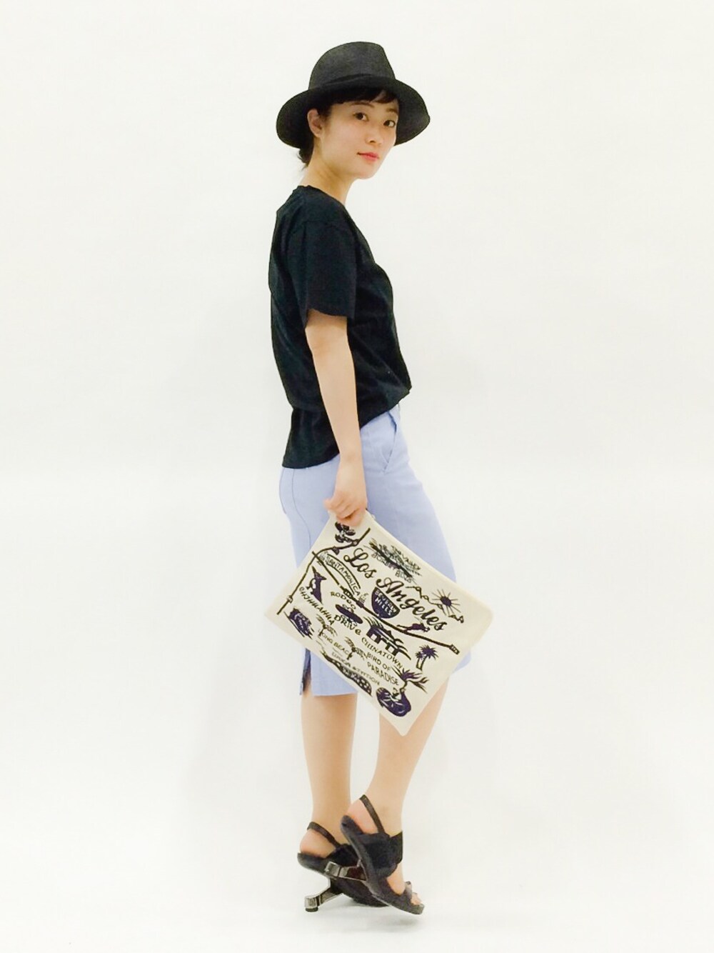 URのタイトスカートで少しレディなコーデにしてみました。 VネックTシャツはビッグサイズでゆったり着れます。 首もとのカットからデコルテがみえてシンプルでも女性っぽいアイテムに。 ラベンダー色がきれいなスカートは、伸縮性のあるタイトスカート。ヒップラインもきちんと出てしまうので、普段ゆるゆるな格好の人も、たまにはこういう緊張感のあるアイテムを着るとスタイルアップにもつながると思います。 ハットはジャストサイズでした。 クラッチバッグはL.Aの風景が刺繍されているにぎやかなバッグ。 わりと大きめでいろいろ入ると思います。
