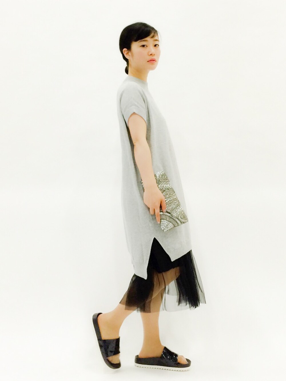 シンプルで大人風のコーデです。上半身は大人しめに下半身をちょっと豪華な雰囲気にしました。