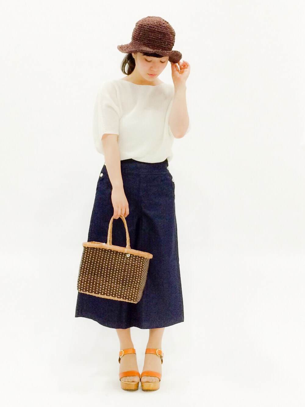 ナチュラルな雰囲気にしてみました。 トップスは透け感と通気性のある涼しいプルオーバーです。 ゆったりとしたサイズで気持ちのいいアイテムです。 パンツはサイドボタンのかわいいワイドパンツ。 なんとなくマリンルックな雰囲気です。 Aラインの広がりがキレイで、足もほっそり見えますね。 バッグはレザー紐が編みこまれたかごバッグ。 なのでとってもしなやかです! お値段は張りますが、珍しいデザインと手の込んだつくりなので一生ものになると思いますよ! ストローハットは、つばにワイヤーが入っていて形が自由自在に! 自分好みの形でかぶれるのでいいと思います。 イタリア製のレザーサンダルは形がよく、カジュアルにも、シンプルにもきれいめにも合いそう。 底も高さがあるのでスタイルがよく見える効果もありますよ~!