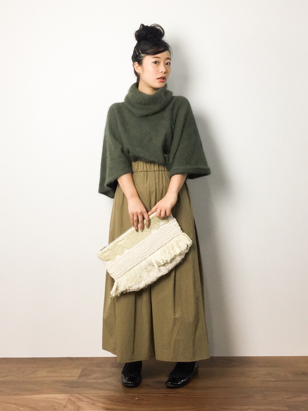 ポンチョをドルマンニット風にアレンジしてきています。 全体的に秋らしさを意識してカラーも落ち着いた感じにしました。 クラッチは絨毯のようにむぎゅっと詰まった生地でかわいかったです♡