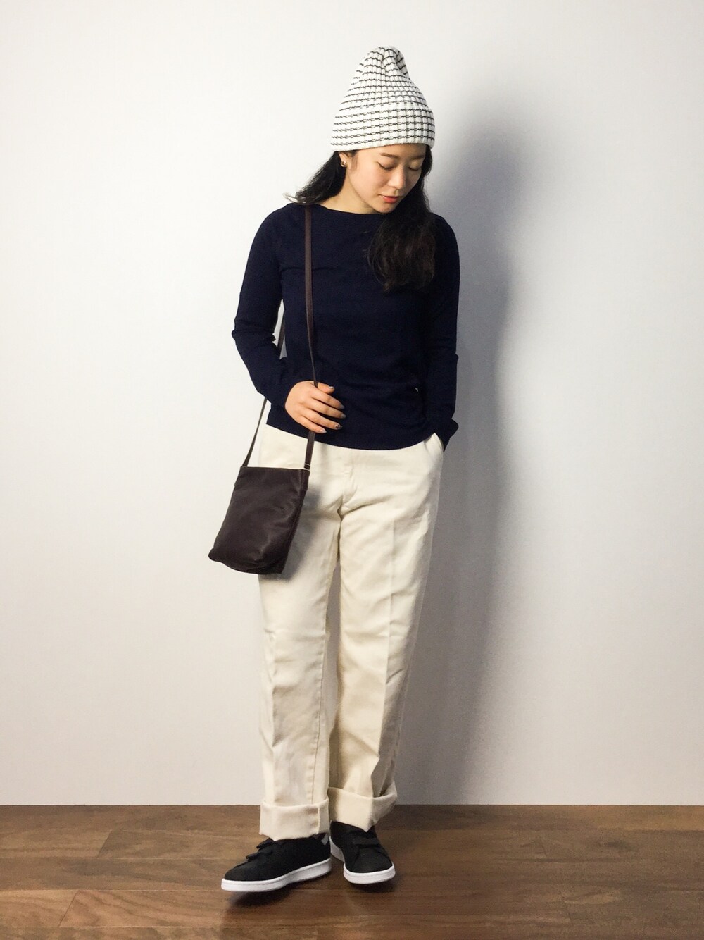 ナチュラルボーイッシュなコーデに。 ネイビーとホワイトの相性は抜群!冬でも夏に流行ったホワイトパンツ履きたいですもんね。 バランスをとりながらダークトーンのニットと合わせるのがいいかなと思います。 シンプルにすればするほど大人っぽい雰囲気になりますよ。