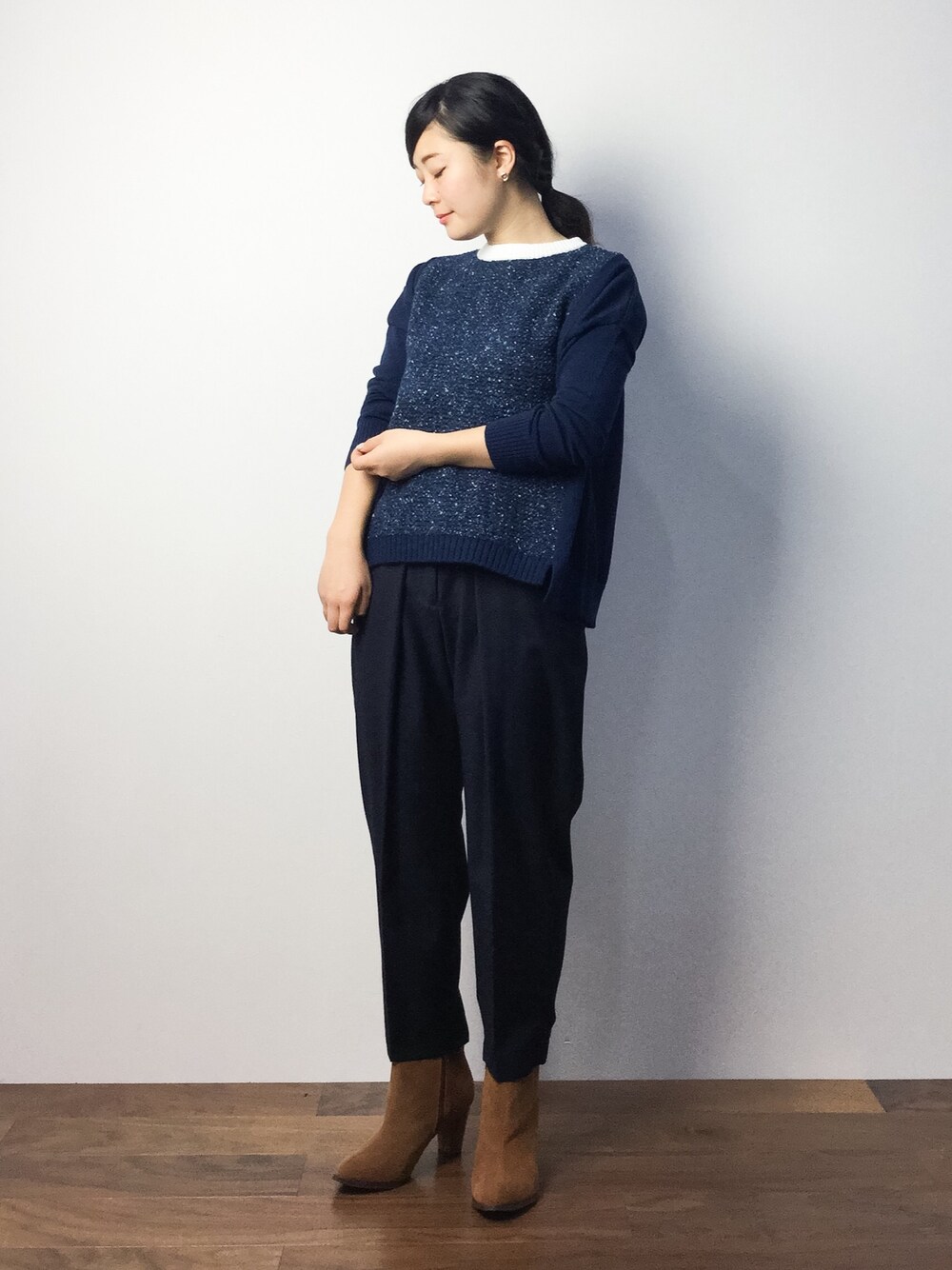 さっと着れて、おしゃれに決まるニットをメインに。 私も大好きなブランド、コーヘンのニットは、ツイード生地を使ったちょっと凝ったデザインが特徴です。 こちらはフロントがツイード、バックスタイルにはスリットの入っており、女心がくすぐられます!♡ ボトムはおとなしいシルエットのものを選ぶとよりトップスが映えると思います^^ 私が着たネイビーカラーは在庫が少し減ってきているので気になる方は早めのチェックがオススメです。