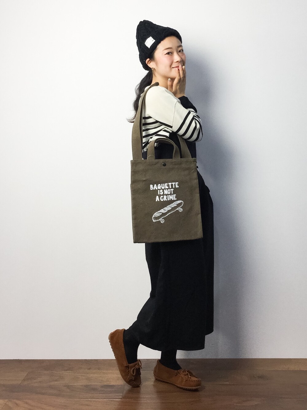 モノトーンのナチュラルコーデに、カーキのバッグを差し色でいれました。 どのアイテムも着心地がよく超オススメなのですが、一つ紹介するならこのバッグ! A4くらいのサイズに見えますが、実は縦に長いバッグになっています。イラストからもわかる通り、長いバゲットもスケートボードも楽々入るサイズ!普段使いはもちろんパンのお買い物の時も、男性ならスケボーでお出かけの際も、これにささっと入れたら見栄えがいいですよ♪