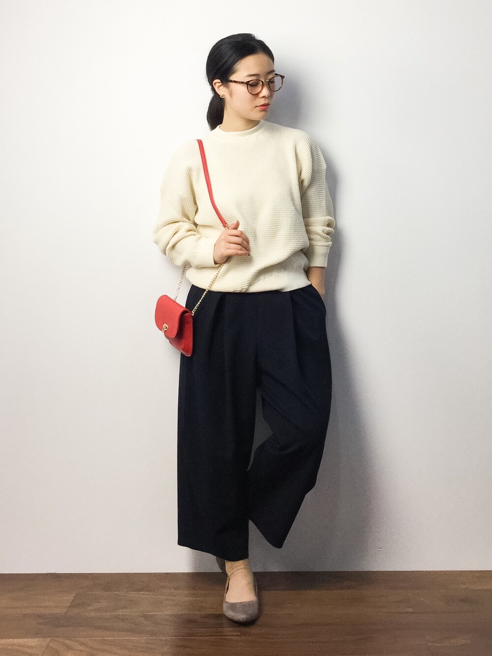 赤のチェーンバッグをアクセントに、他はシンプルにまとめました。 トップスのワッフルニットはふわふわとしてとても着心地が良かったです。リブがあるので、ダラっとした印象にならないのもポイントでした♪