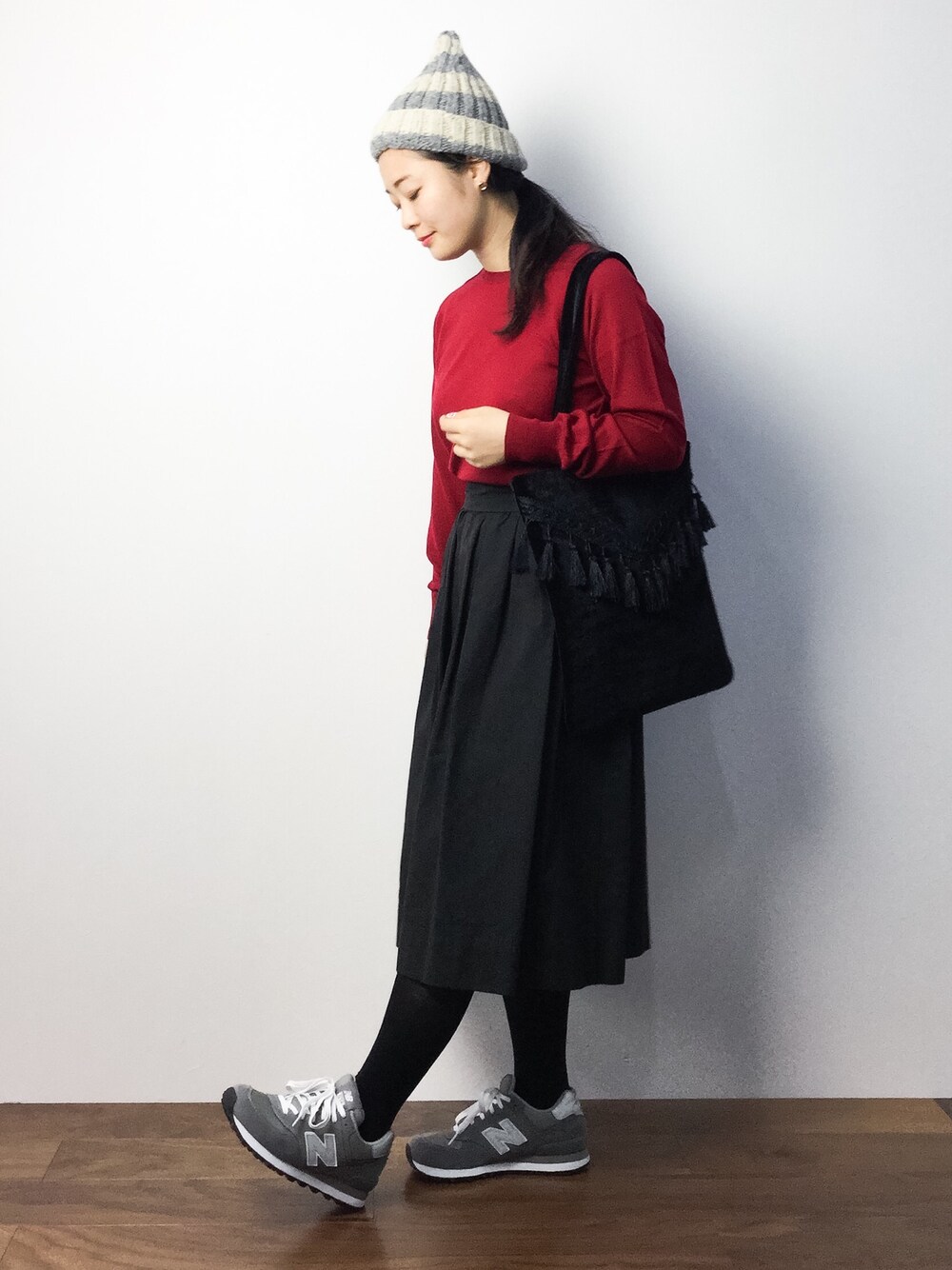 赤いニットをメインに、グレーとブラックでスッキリまとめました。 ふんわりしたスカートは、ウエストがゴムなので着脱がとてもラクなのに、トップスインでもきれいにキマリます!◯^^ フリンジ付きのバッグは、カジュアルコーデにも、モードなスタイルにも合いそうな雰囲気が素敵でした。 生地も高級感があるので結婚式などのセカンドバッグとしてお持ちになるのも良さそうです!