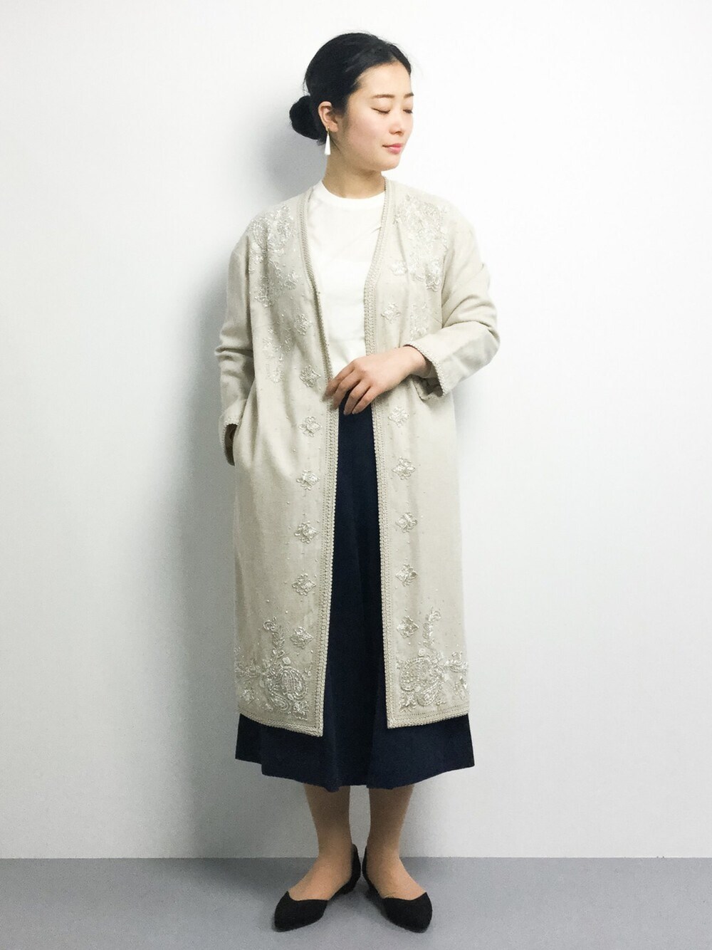 すっきりシンプルスタイルです。 写真だとわかりづらいのですが、こちらのコートは、ビーズ刺繍が本当に素敵で、 個人的にもほしいなと思わせてくれるアイテムでした。 着心地も軽くて楽チンです^^