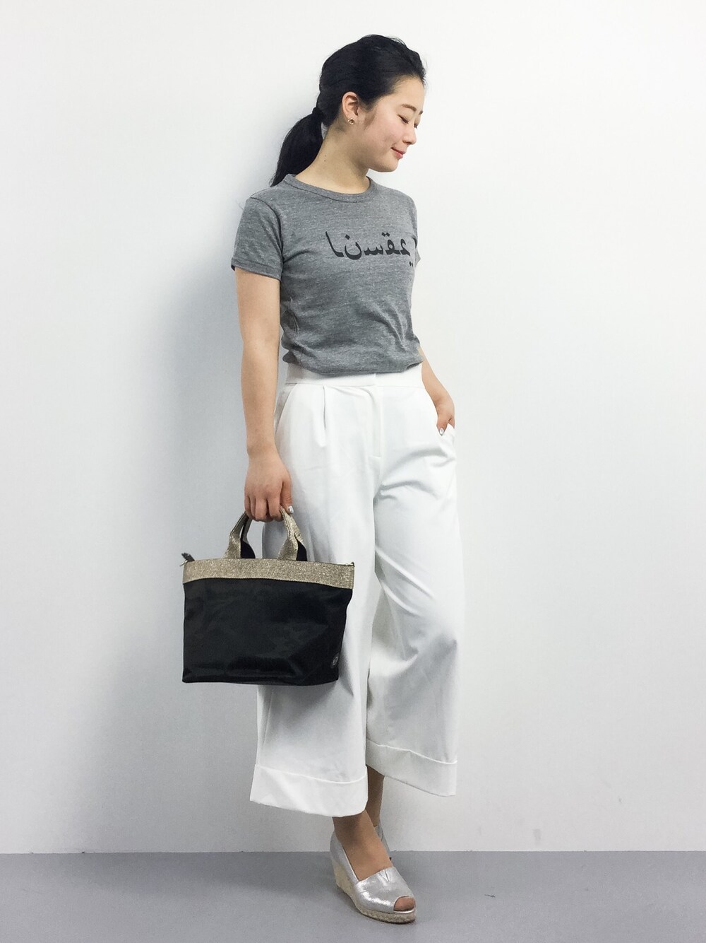 大人シンプルスタイル。 Tシャツを大人っぽく合わせたくてホワイトパンツにシルバーシューズですっきりまとめてみました。