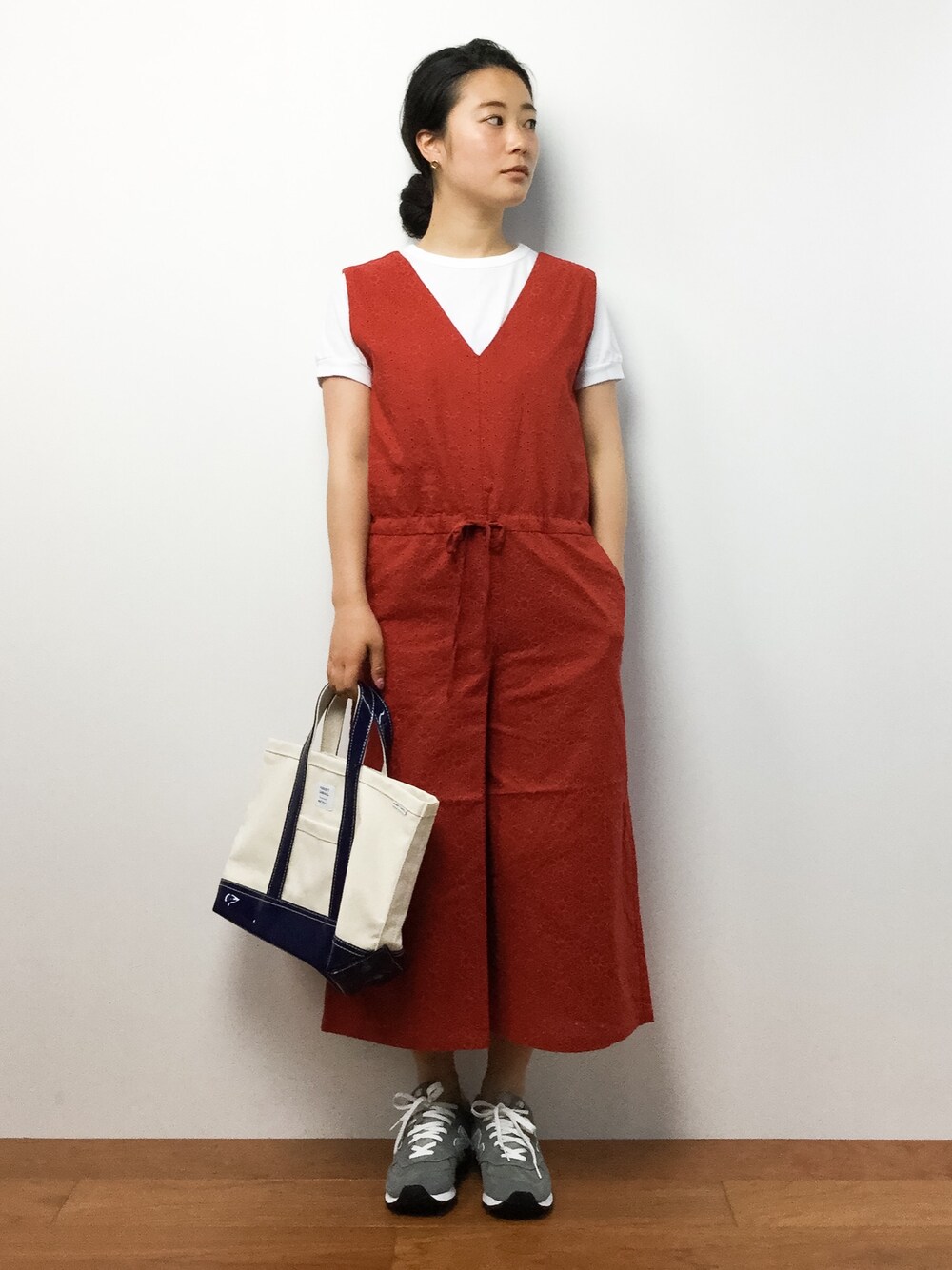 少し落ち着きのある赤いオールインワンで、大人っぽくかつ、夏を盛り上げるコーデに* 素肌に着てもかわいいアイテムは中にあわせるインナーを変えて、秋まで活躍してくれそうです^^