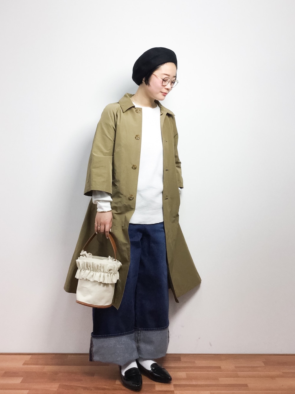 ボーイッシュに古着スタイル風で。 アウターは、つるっとした生地で、軽くてとても重ね着しやすい、腰紐がついているので、結べばフレアワンピースのように裾が広がります。 こちらはセールで50%OFFに!ベージュはすでに完売なのですが、もうすこし暗いブラウンカラーがあり、そちらも大人っぽくて素敵だと思います。^^ バッグは注目度が高まるバケツバッグ。 春夏物で、コットン生地×レザーのデザインがとてもかわいいです。 まだ寒い日が続いていますが、小物から春物を取り入れていくのもオススメですよ♪