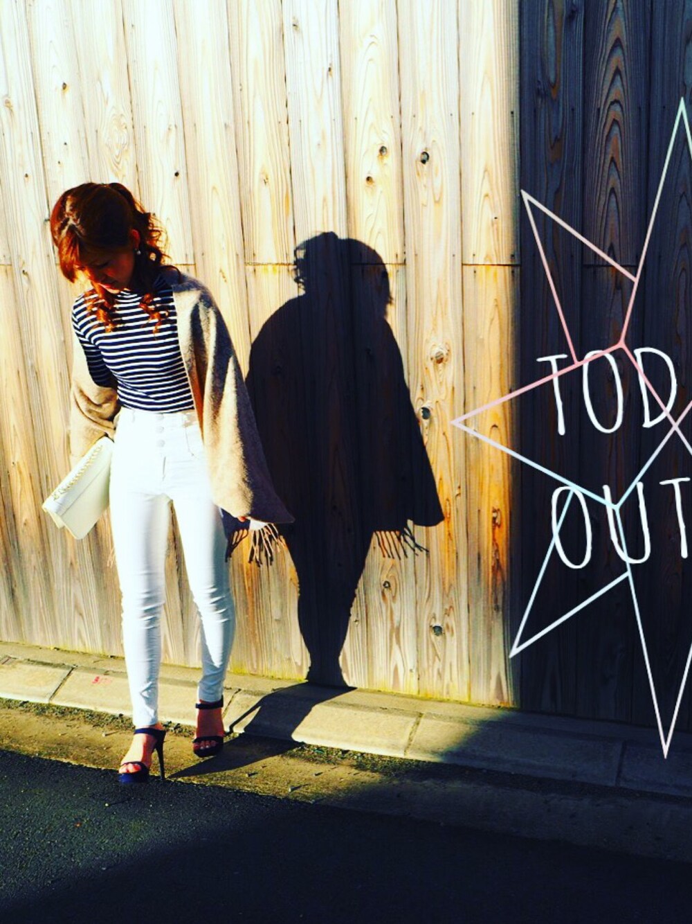 topsが短めなので.ハイウエストで バランスをとりました(°∀°)♪♪ 肌寒い日だったのでストール羽織ってます♪