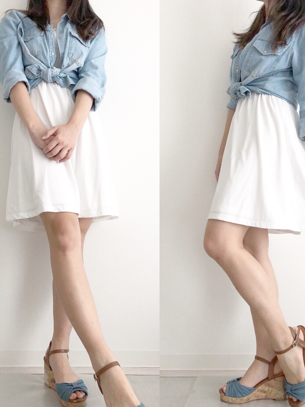 ・ ・ 白ワンピースの上にデニムシャツを重ね着〜 ・ 意図せずGUコーデになってました😅 ・ もう夏が終わる……… ・ ・