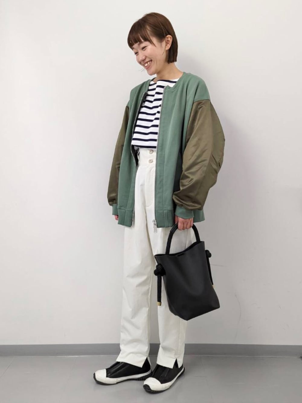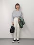 異素材ドッキングがアクセントのブルゾンを主役にコーディネート。細身のボトムにカットソーをインする事で大人カジュアルなスタイルにしました。