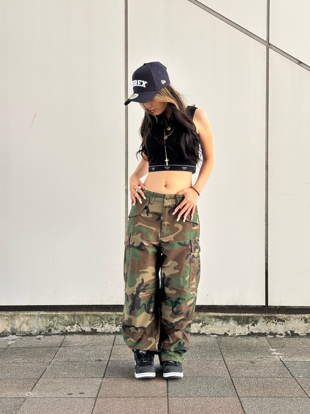 太めのカーゴパンツとピタッとしたタンクトップの組み合わせがかわいいです!