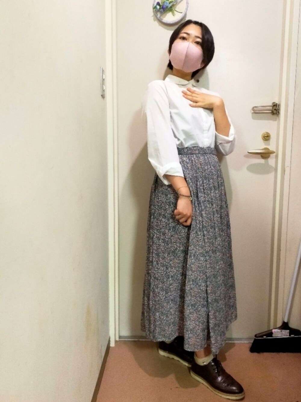 今日はこのシャツを着たい!と思いコーディネートしました。 丸襟で、写真では分かりづらいのですが襟に装飾があって可愛いんですよ〜🤭 お気に入りシャツですね☺️