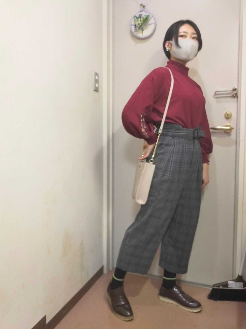 今回はチェックパンツでコーディネートしました! このパンツはシャツ系と合わすと学生服感が強くなってしまうので、シャツとは合わせられないんですよね…😅