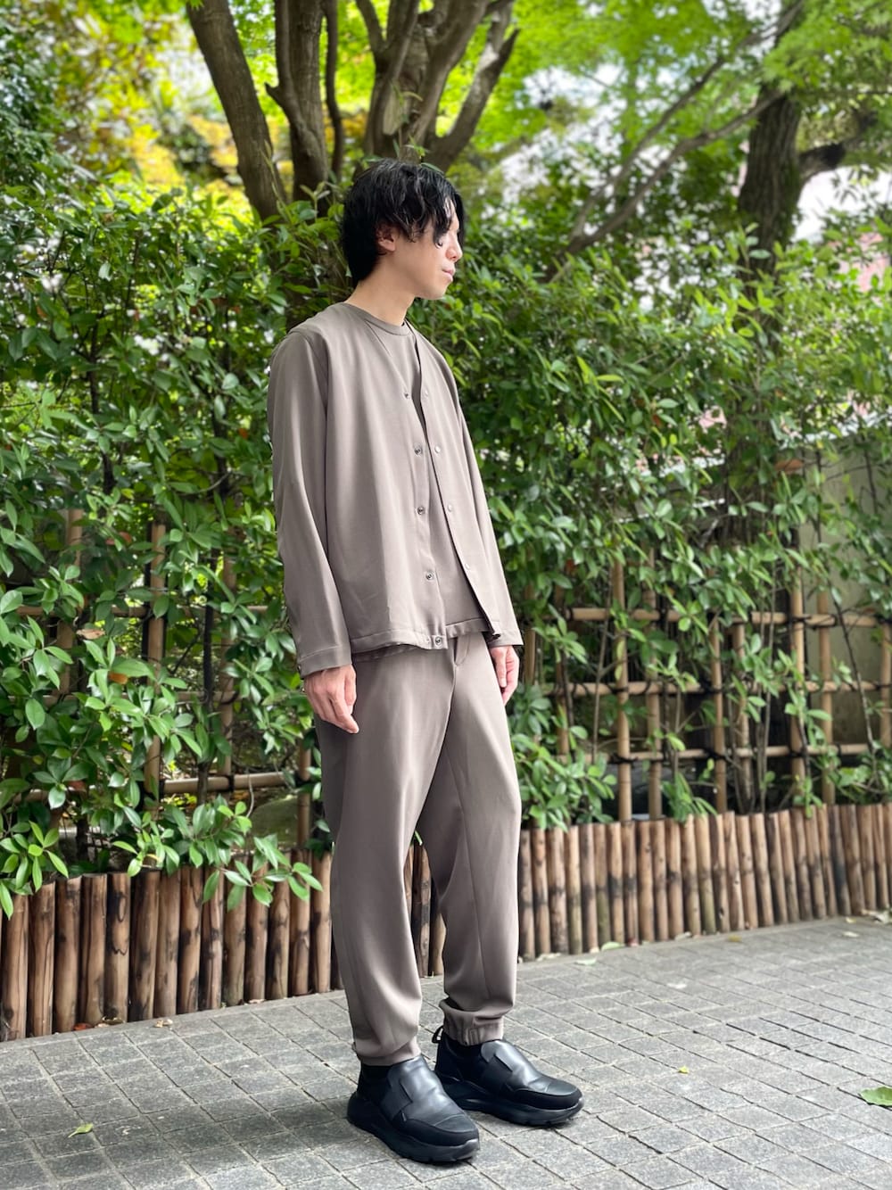 サマーウールのようなドライなタッチのセットアップコーデ。 足元には合皮の新型スニーカーを合わせました。