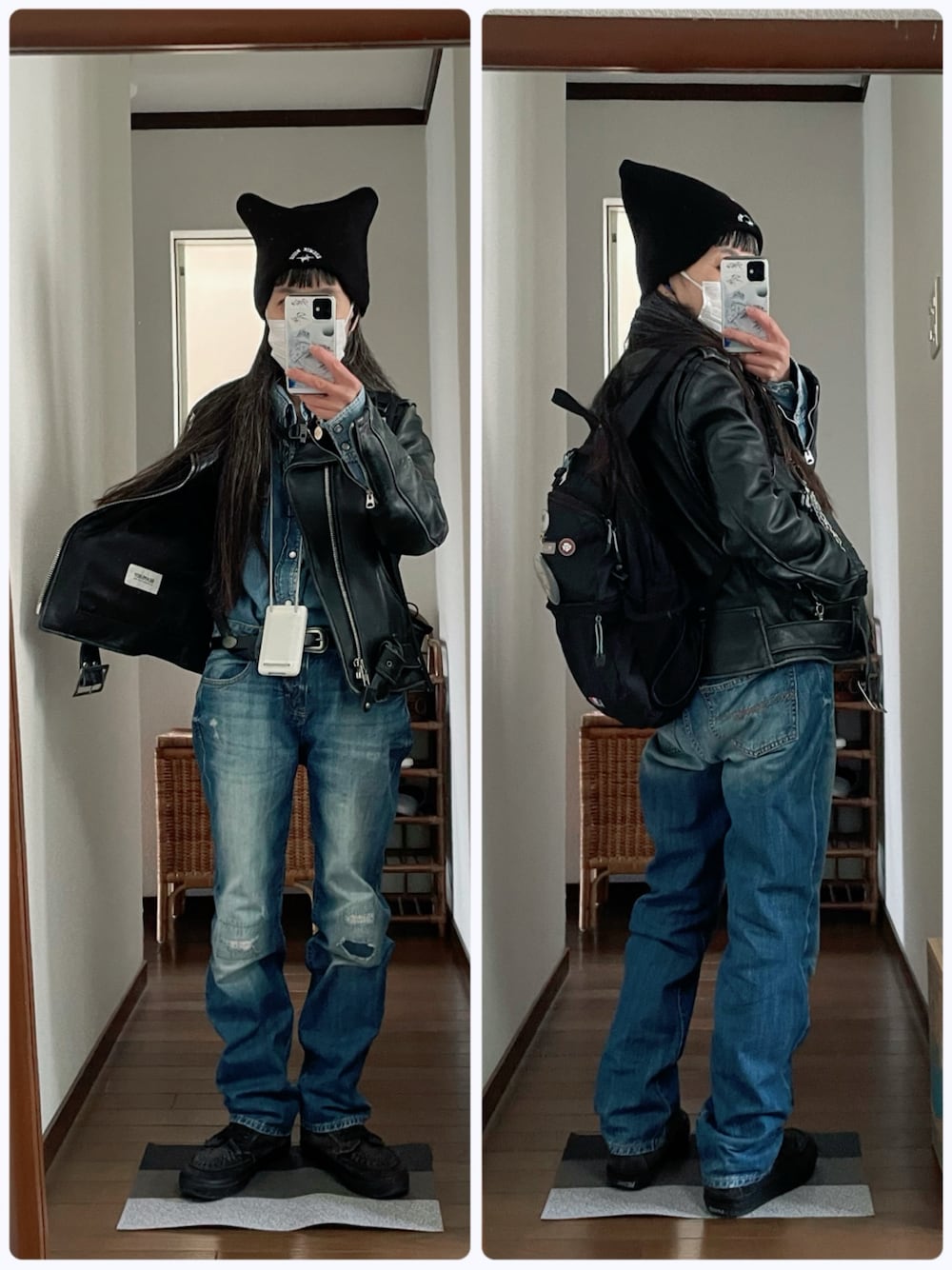 中途半端なあたたかさなので、ニットキャップあり、マフラーなし デニムシャツをデニムパンツにイン、ライダースジャケットとVANSのキッズスニーカー(ラバーソールみたいな感じ)を合わせました 隠れ脱水にならないように、今から歩いて体力維持ファイティン!