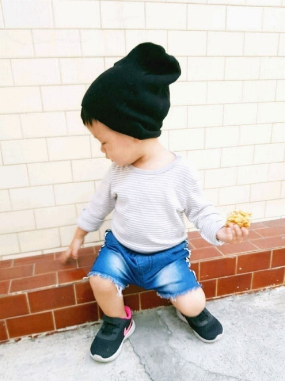 午後散步穿搭 午睡時所穿的簡單包屁衣 加上刷白的運動風牛仔短褲和球鞋 秋天午後稍微有涼風 配上針織毛線帽