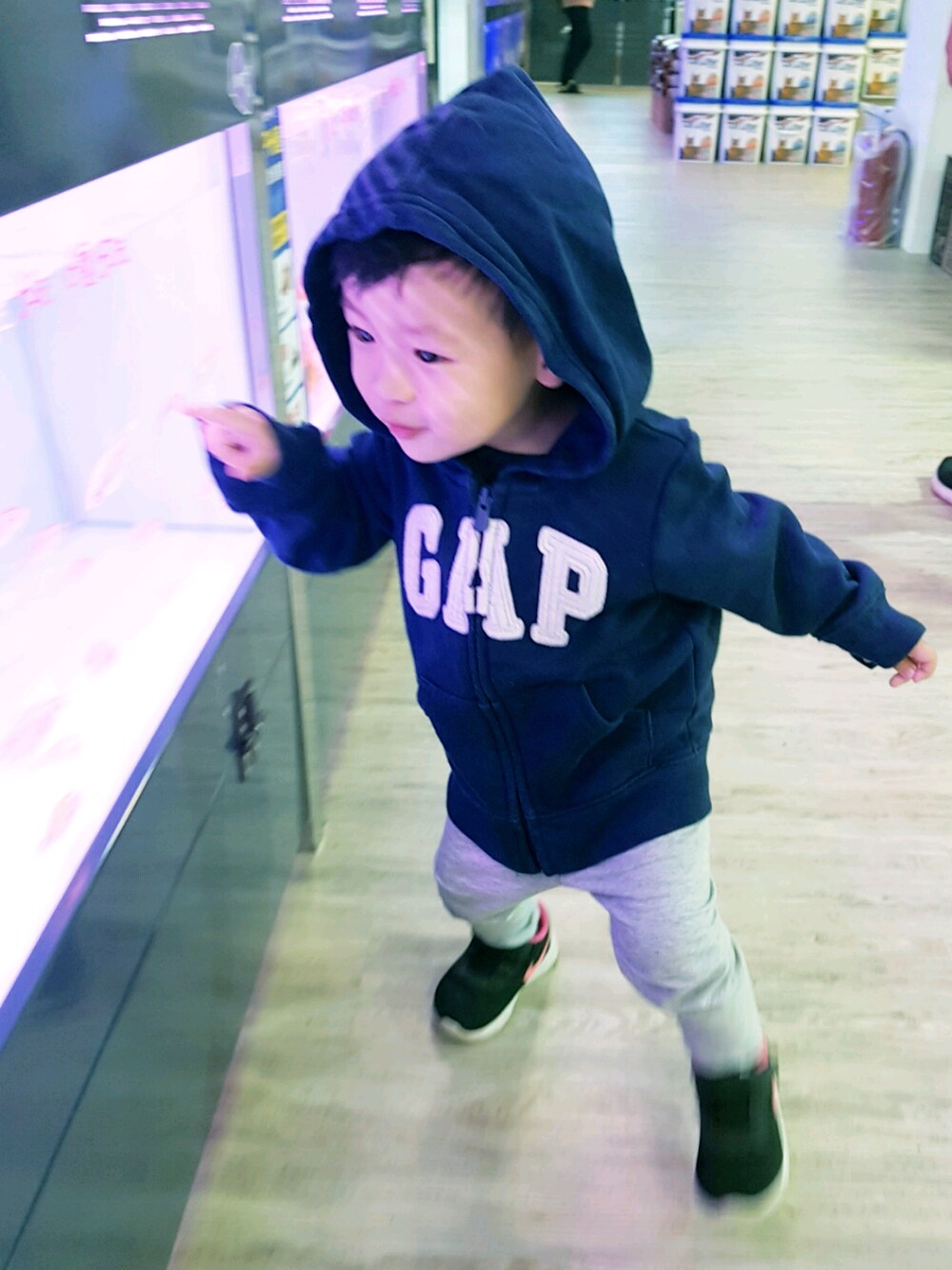 吃完晚餐跟爸爸逛寵物用品店 babygap的連帽外套可以當外套也可以當連帽厚T,很實用的單品