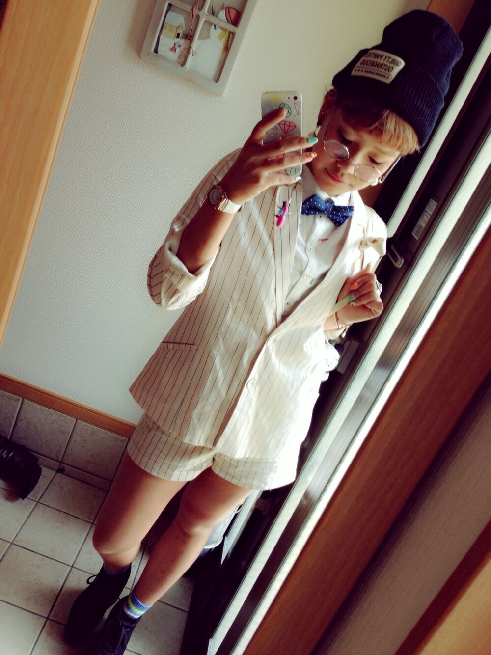 セットアップ で 蝶ネクタイ して おめかし コーデ ( ^ω^ ) シャツ 蝶ネクタイ ▷ mothers 靴下 ▷ tutuanna シューズ ▷ lowrys farm
